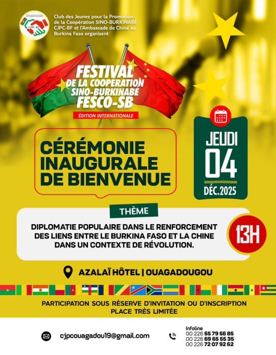 Le club des jeunes pour la promotion de la coopération sino-Burkinabè et l'ambassade de Chine au Burkina Faso vous invitent... Voir plus